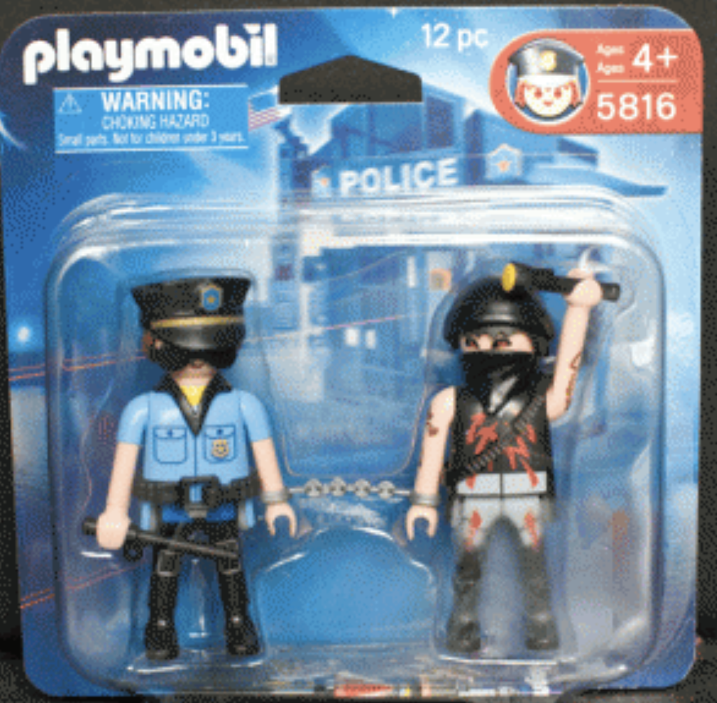 Here is a great toy for those parents who regret having had children too late to have to explain the Village People. As the packaging indicates, this is a toy for children ages 4 and up. (It can’t be marketed to children under four, because it has small parts — an issue I won’t address at this juncture.) Imagine the hours of fun explaining this toy to your four-year-old. Is it a policeman and a bloodied demonstrator, or something else entirely? Is this just your usual globalization action-figure toy set? Or is there something more going on? And if this is not just a toy depicting the travails of late capitalism, what are we tell our four-year-olds?