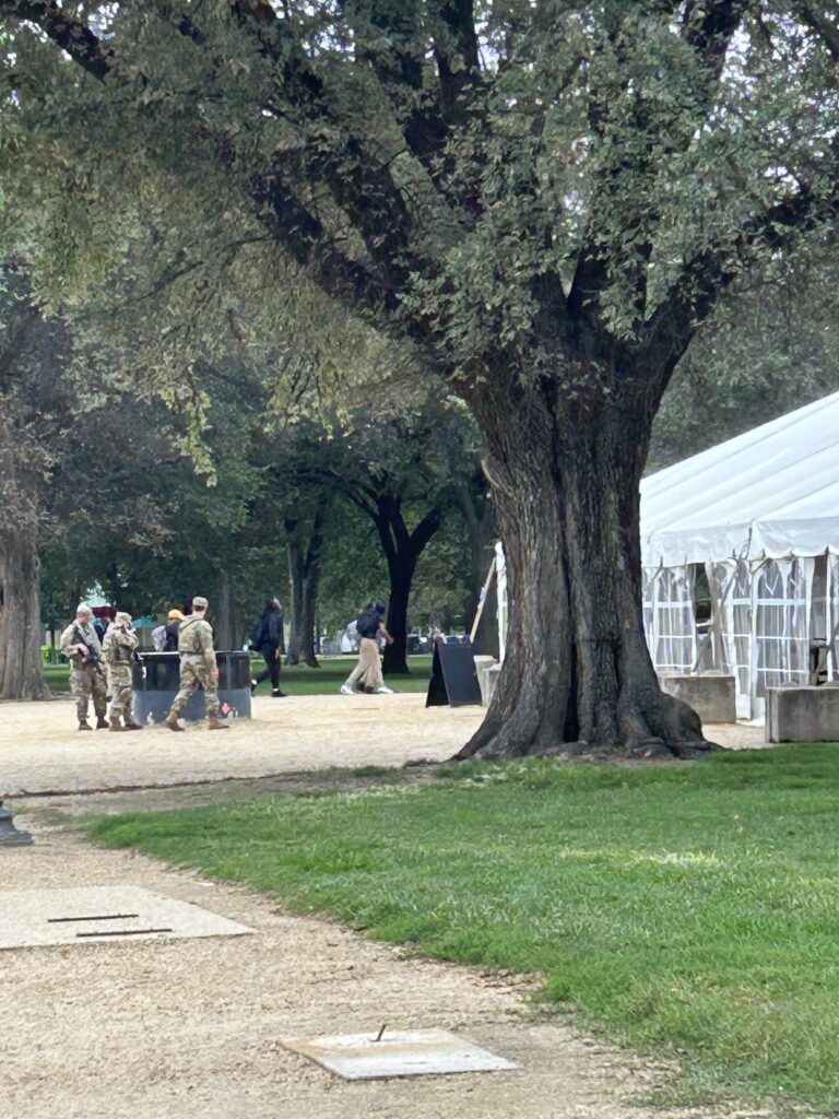 Having not seen what I figured I wouldn’t see, I walked around the mall. (The joys of retired life.) There, I saw groups of National Guard soldiers, armed with long guns–no doubt for protection against the hordes of vicious squirrels who hang out on the mall.